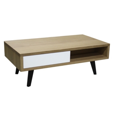 Table Basse 2 Tiroirs Style Scandinave Chene Massif Blanchi Et Laque